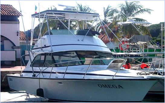 Yate Omega es un Yate de 35 pies que cuenta con dos motores, cabina, baño, camarote y espacio en la parte de arriba, la capacidad para los recorridos en este yate es de 14 personas.